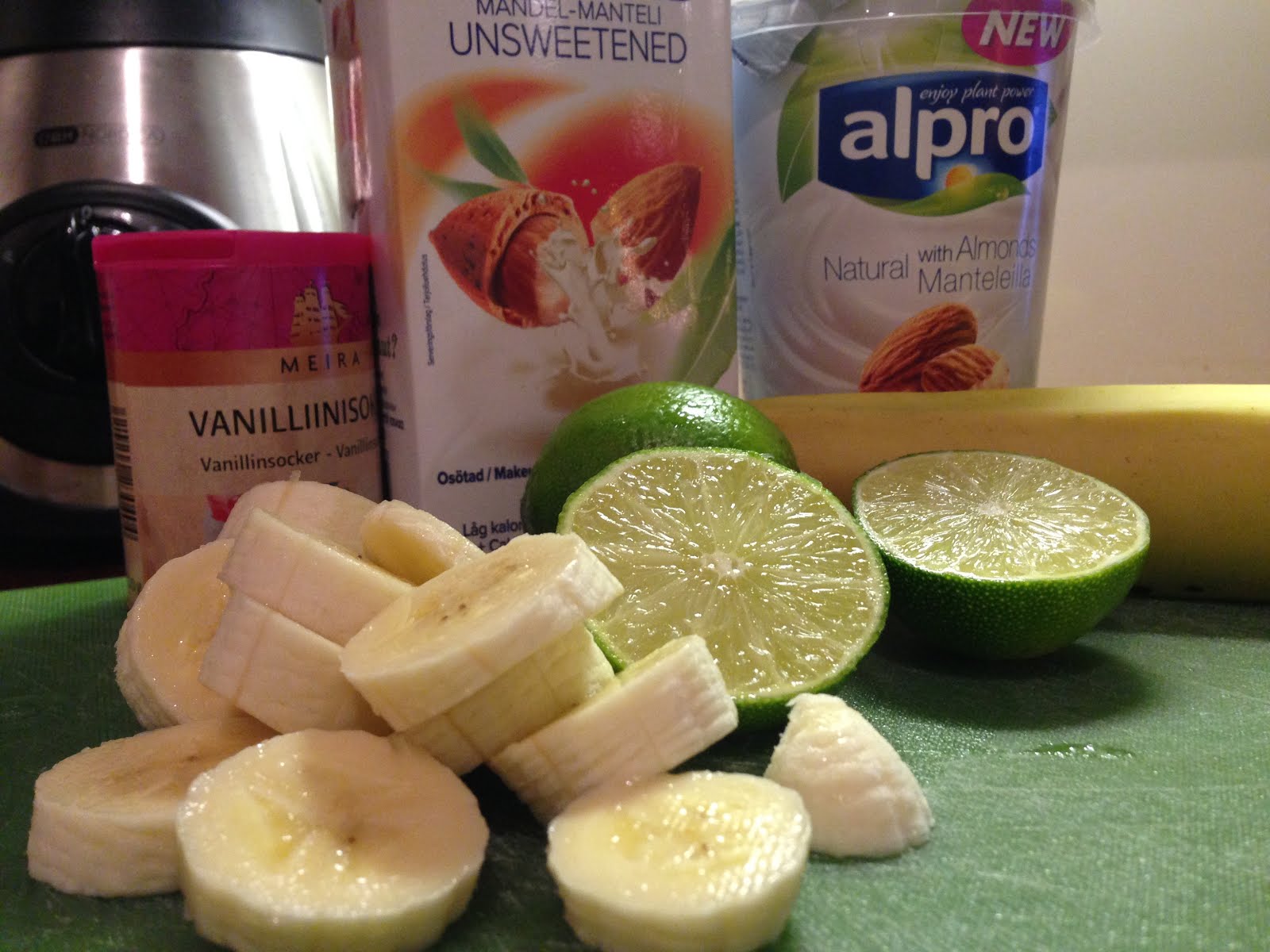 Aloita ottamalla ainekset esiin. Pilko banaani pieniksi paloiksi ja puolita lime. Laita banaani ja vaniliinisokeri blenderiin. Purista limen mehu päälle. Pyöritä blenderiä kunnes banaanit ovat survoutuneet. Lisää vielä mantelijuoma ja soijajogurtti. Pyöritä vielä vähän aikaa kunnes kuohkeaa. Asettele tarjolle ja nauti :oP