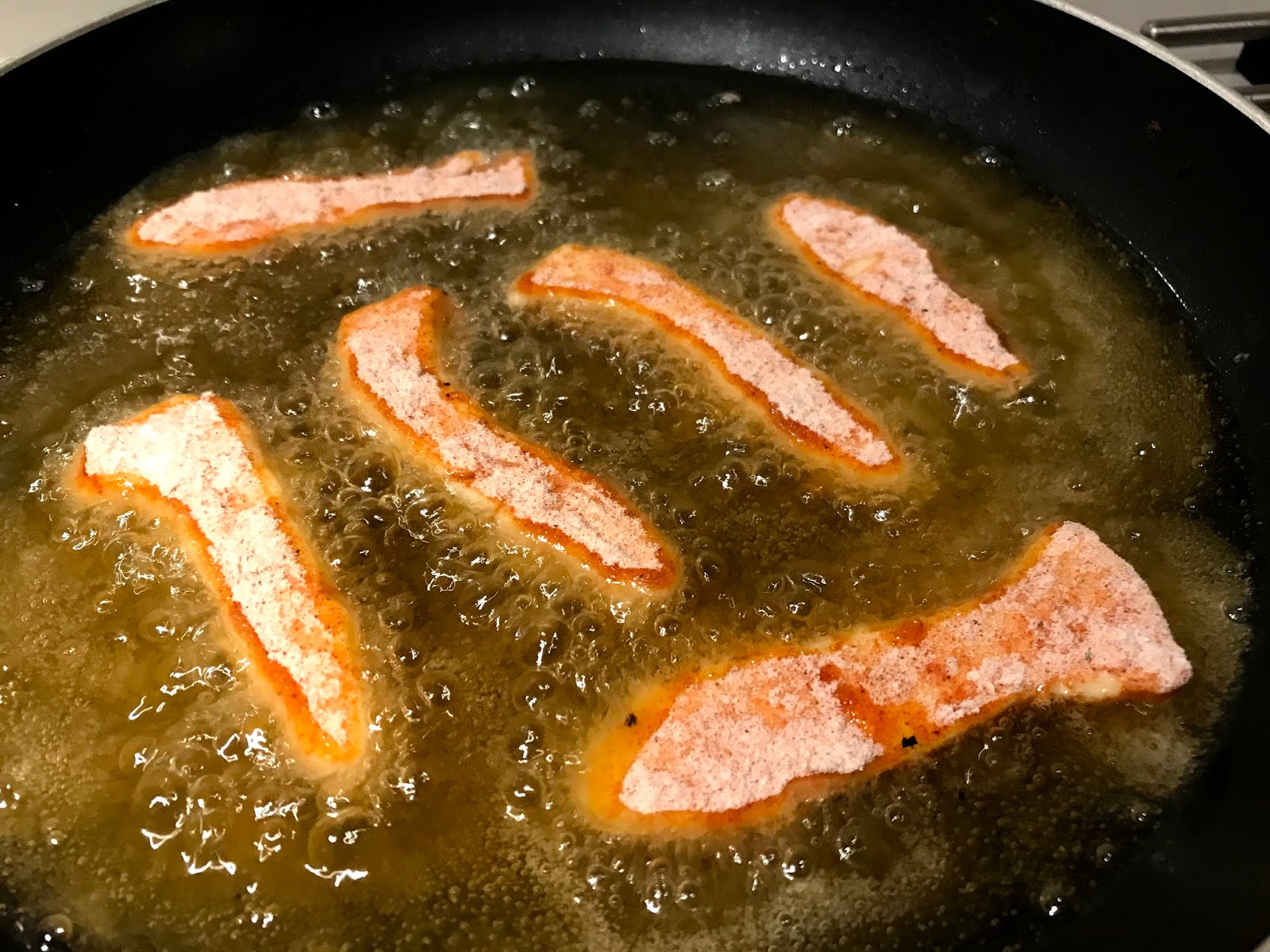 8. Kaada paistinpannulle rasvaa niin, että pannulla on 2-3 senttiä rypsiöljyä. Tarkista mittarilla, että rasva on 180'c asteista. Mikäli et omista mittaria, niin kokeile pienellä palalla juustoa. Mikäli öljy alkaa välittömästi kuplia, asettele pannulle muutama juusto friteroitumaan. Kääntele välillä.